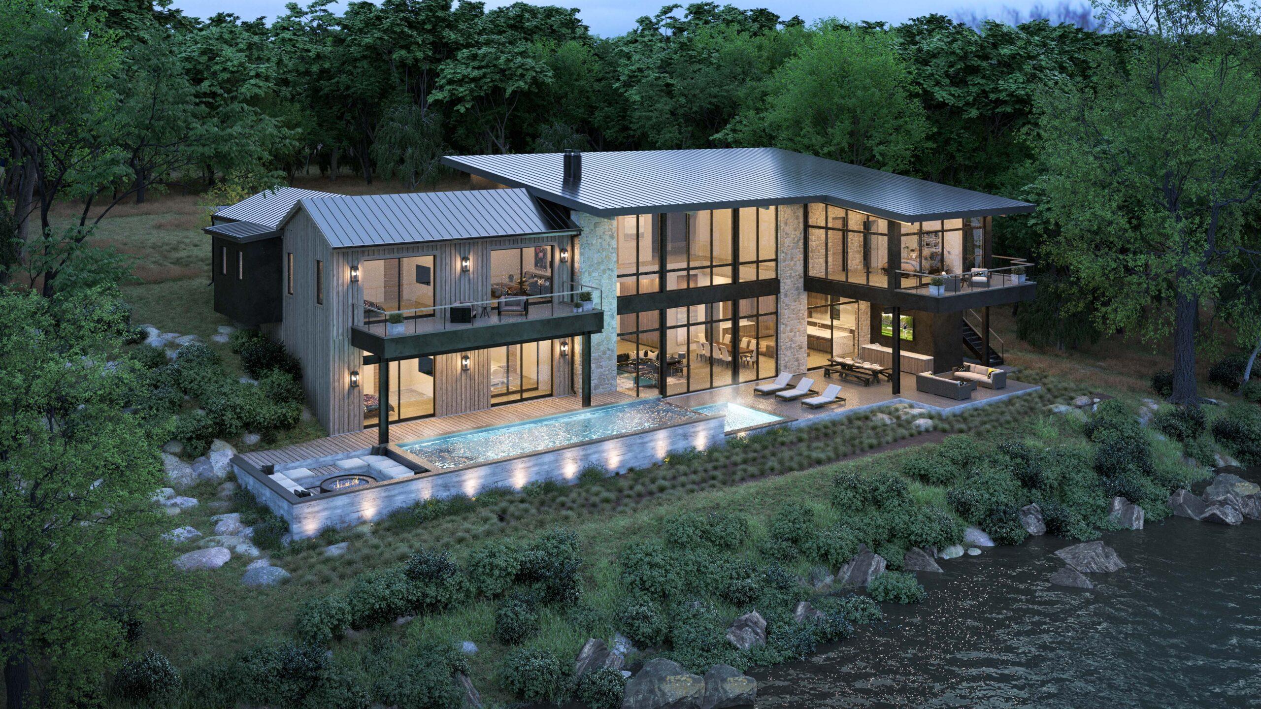 The daylight lower-level spills out to the river and the home is laid out with reverse living with communal and entertainment spaces focused downstairs and private spaces upstairs. This allows areas such as the kitchen, dining and great room to be located on the lower level that circulates out to the river. The great room and dining room boast 23’ tall ceilings that flow out to a large patio with pool, baja shelf, sunken firepit and outdoor kitchen.