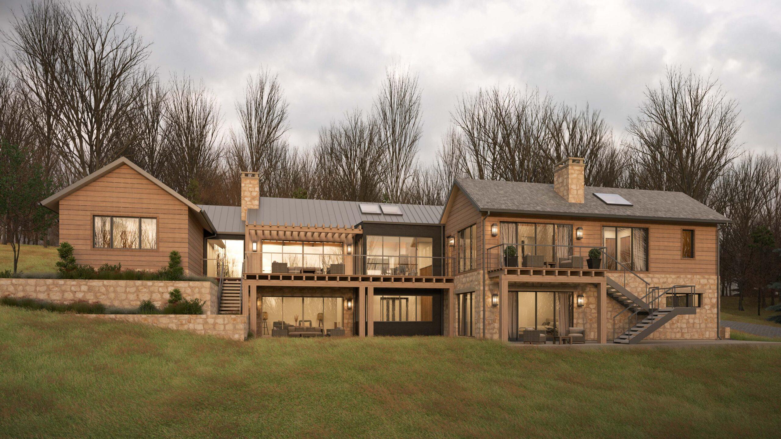 The Gunstock Residence is set on an 18-acre parcel in Gilford, New Hampshire, overlooking a forested landscape with long views toward Lake Winnipesaukee and the distant Mt. Washington. Designed to respond to the region’s long, dark winters, the home prioritizes daylight through vaulted interior spaces, a fully daylit basement, and a network of skylights that draw light deep into the plan throughout the year. Exposed beamwork and tongue-and-groove finishes define the architectural language, adding warmth and texture while reinforcing the home’s structure. Glass connections between the home’s massing create moments of transparency and visual continuity, linking interior spaces to the surrounding landscape and framing views of the lake and forest beyond.
