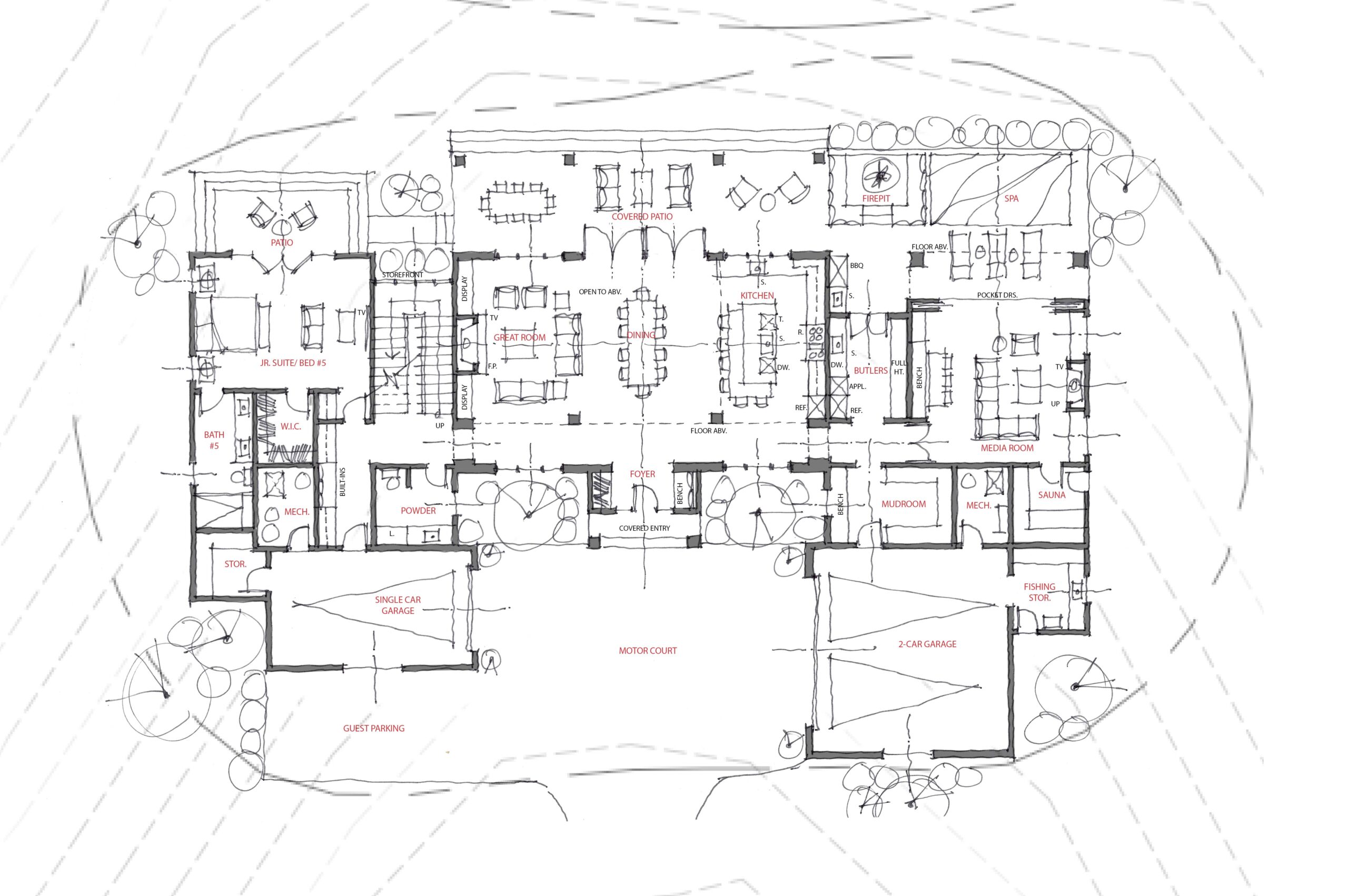 Hand drawn floor plans include rough furniture layout, door and window openings and built-in cabinets. This allows us to discuss the flow of circulation, rough square footages and review the programming and its adjacencies. Site design with rough landscape elements is also presented to aid in the indoor outdoor flow of your home and describes potential views.